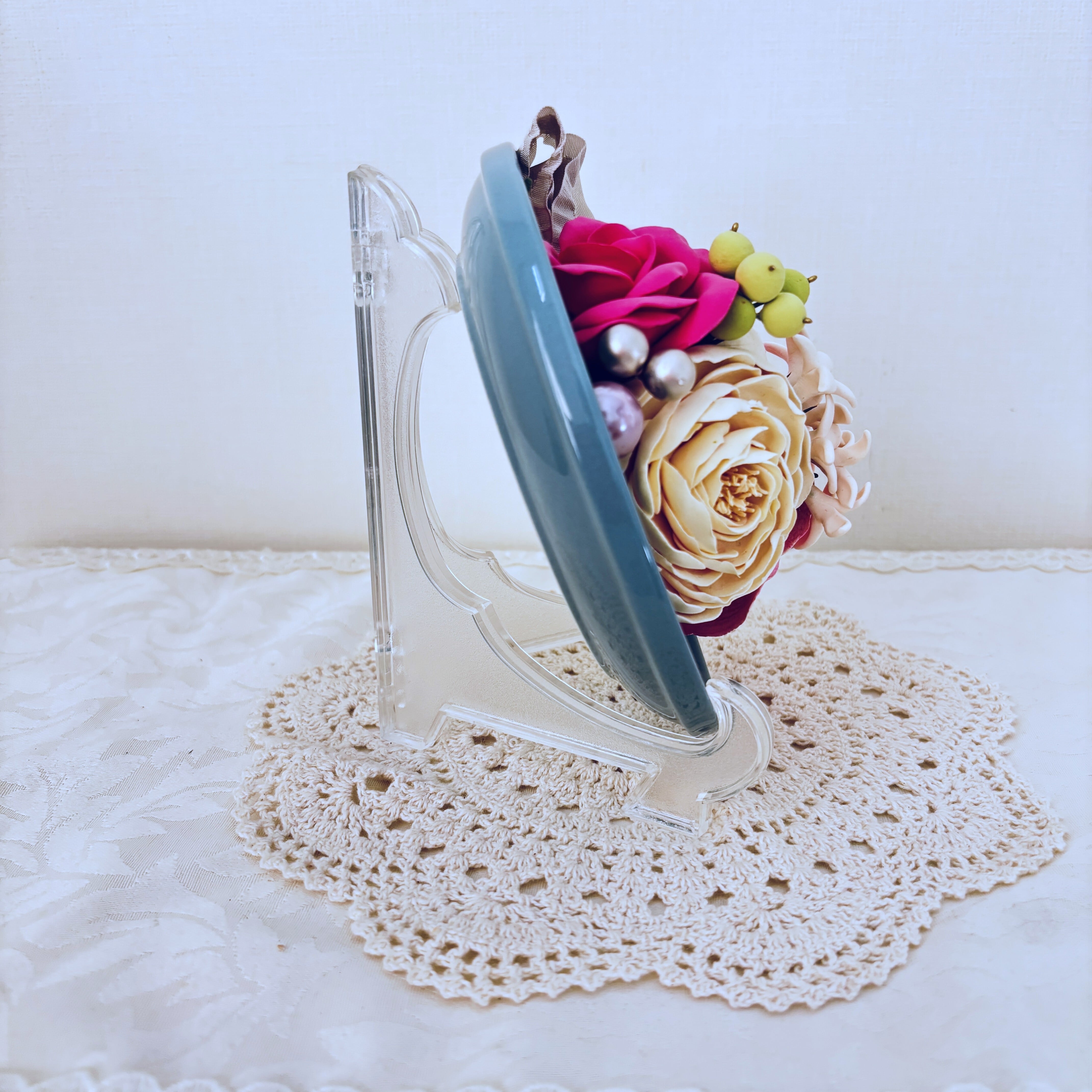 ※クレイフラワーは半永久的に飾っていただけます。お手入れは、ほこりが気になる場合は、ハケやフデでそっとなでてお取りください。なお、湿気・水分に弱いため、洗面台やお風呂場などで飾ることはご遠慮ください。また、水洗い厳禁です。また、収納の際も湿気・結露にご注意ください。