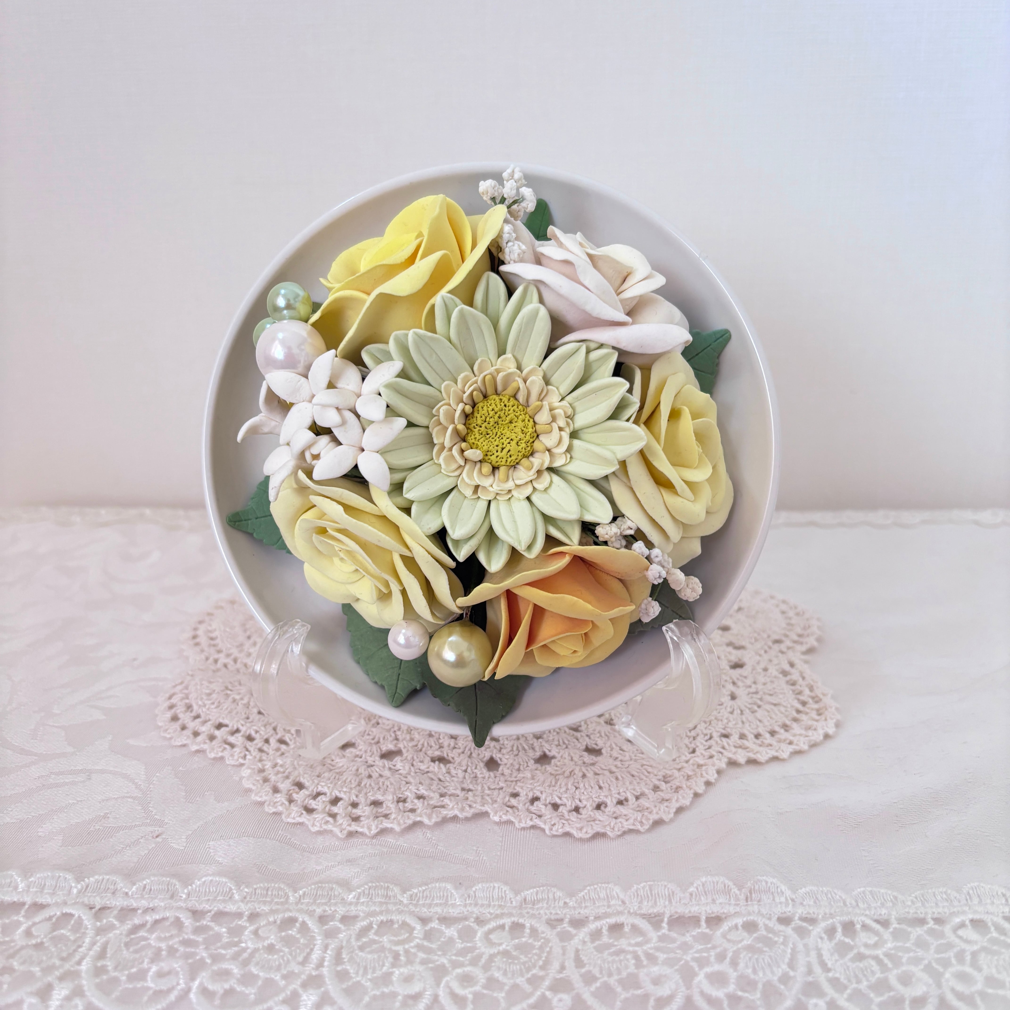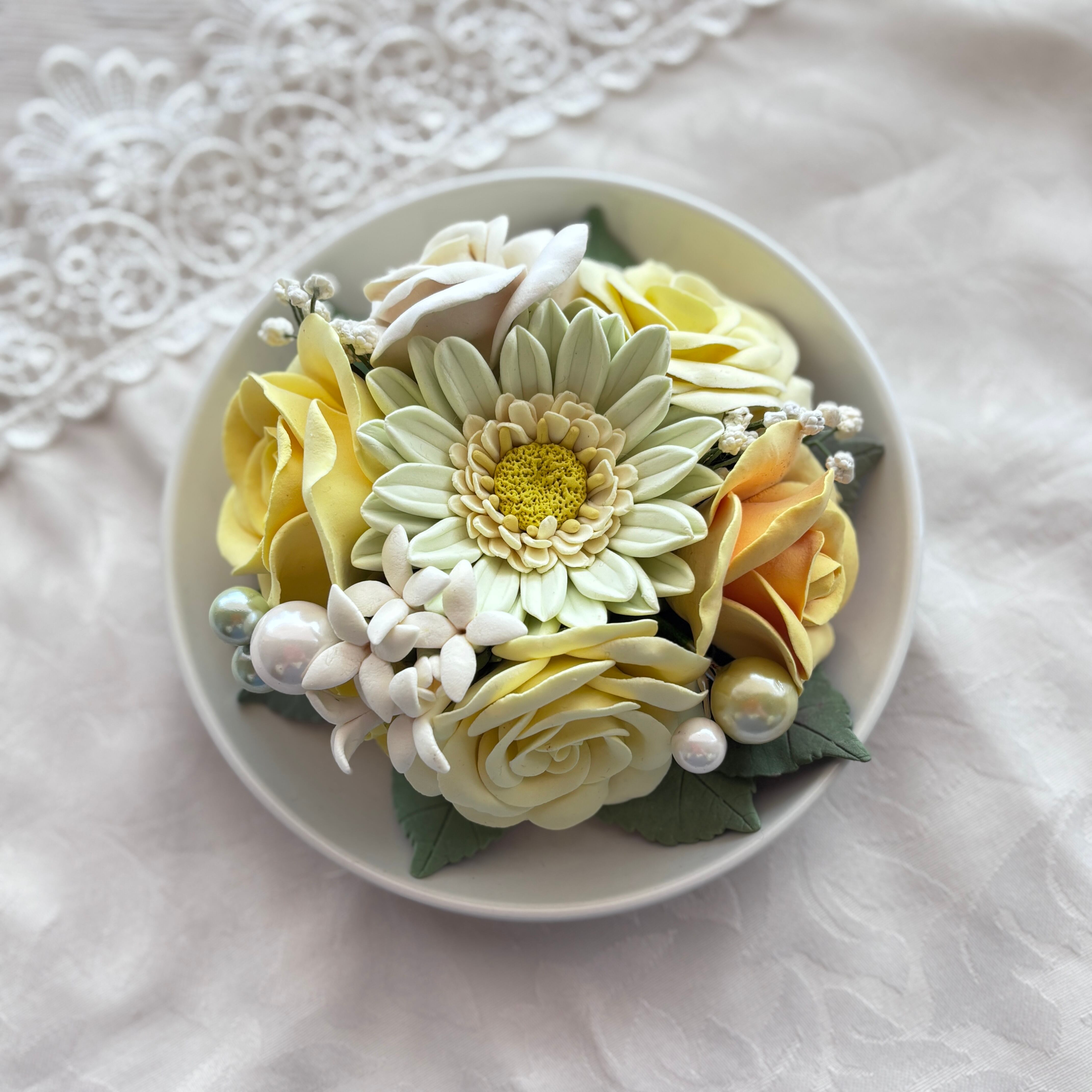 ナチュラルで上品な雰囲気に仕上げたクレイフラワーアレンジです。